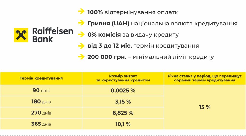 *Умови, наведені в даній Пропозиції, є орієнтовними. Банк залишає за собою право встановлювати до кожного клієнта індивідуальні умови або відмовити у наданні фінансування.